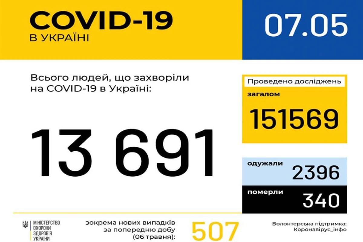 За даними ЦГЗ, станом на 09:00 7 травня в Україні 13691 лабораторно підтверджений випадок COVID-19, з них 340 летальних, 2396 пацієнтів одужало. За добу зафіксовано 507 нових випадків.