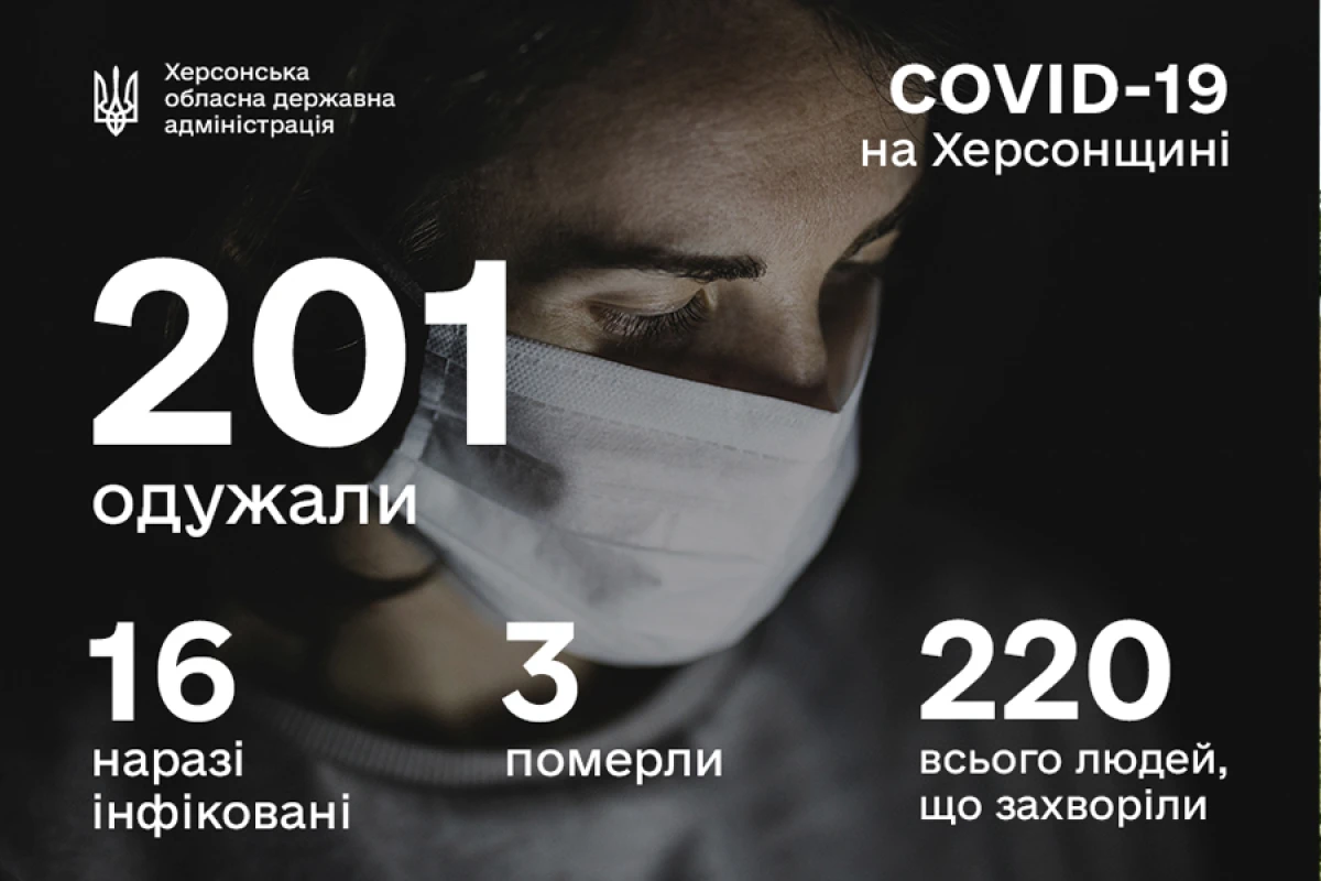 Наразі на Херсонщині хворіє 16 осіб, 201 вже одужала і 3 померли.