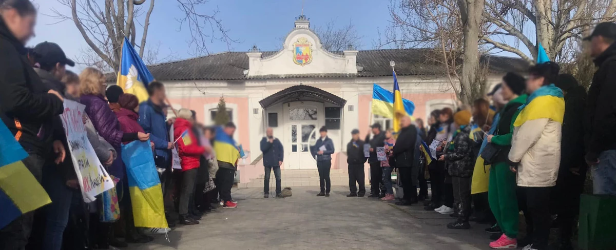 Голопристанці вийшли з плакатами та скандували: "Свободу меру!", "Свободу полоненим!", "Гола Пристань - це Україна!", "Херсонщина - це Україна!"