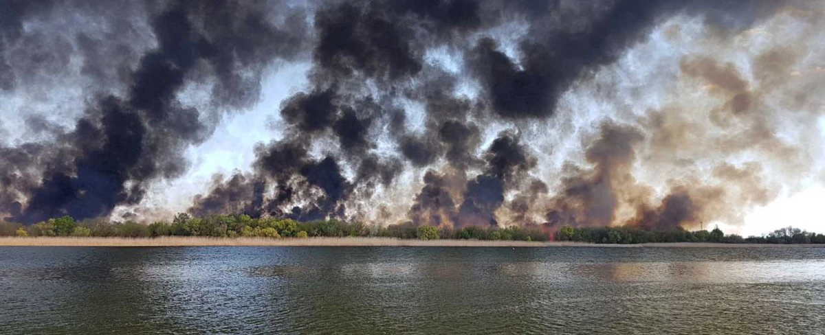 У четвер, 28 квітня, на лівому березі Дніпра навпроти Херсона триває масштабна пожежа. Мешканці повідомляють, що горять плавні біля дач.