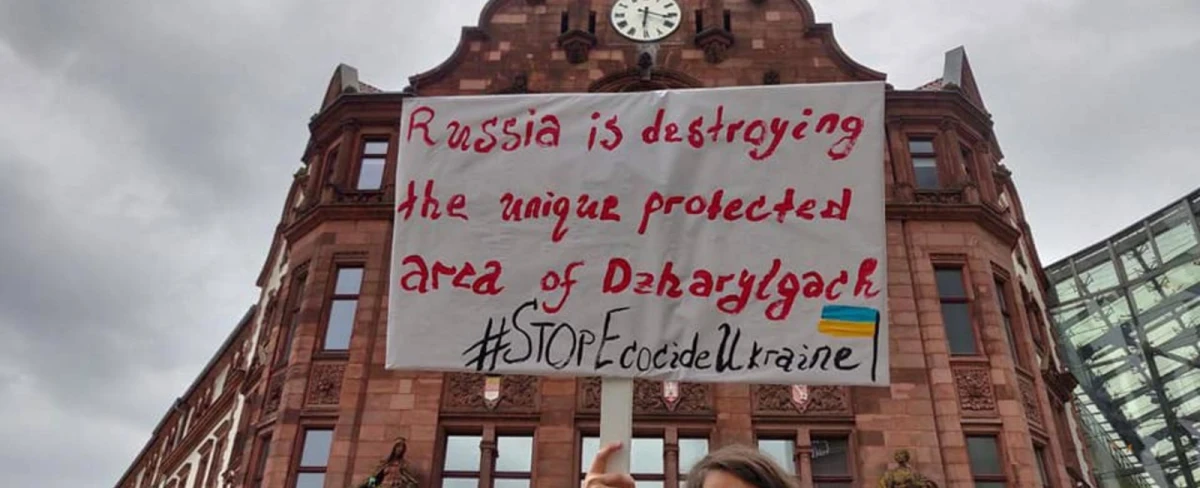 У рамках кампанії #StopEcocideUkraine активісти кількох європейських країн вийшли на вулиці, щоби розповісти всьому світу про знищення росіянами унікального острова Джарилгач, де зберігалися унікальна флора та фауна, зокрема, прибережні групи дельфінів-білобочок, афалін і морських свиней.