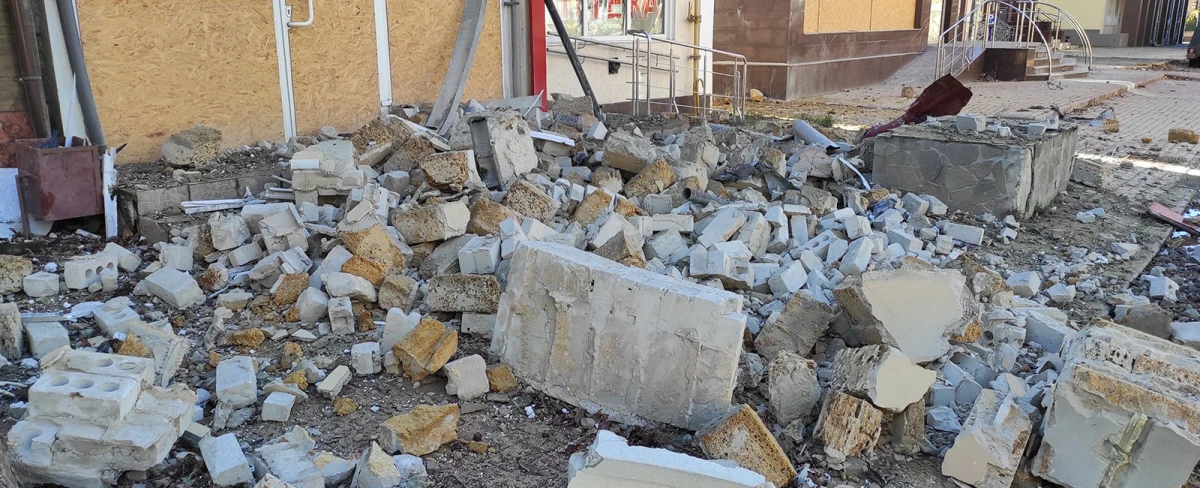 На фото видно, що в аптеці пошкоджені вікна, а в будівлі поруч – дах.