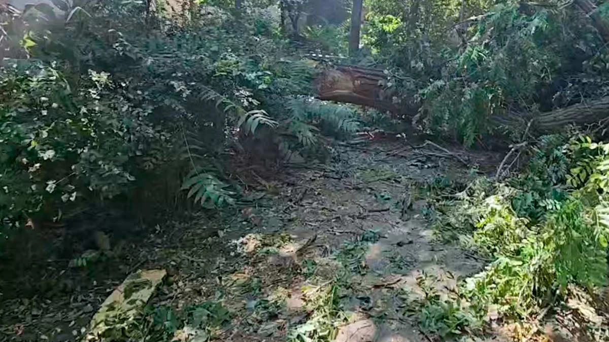 На відео видно, що пошкоджені вікна, стіни посічені уламками снарядів і повалені дерева.