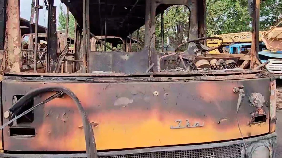На відео видно, що деяка автотехніка повністю згоріла, в деякій вибиті вікна.