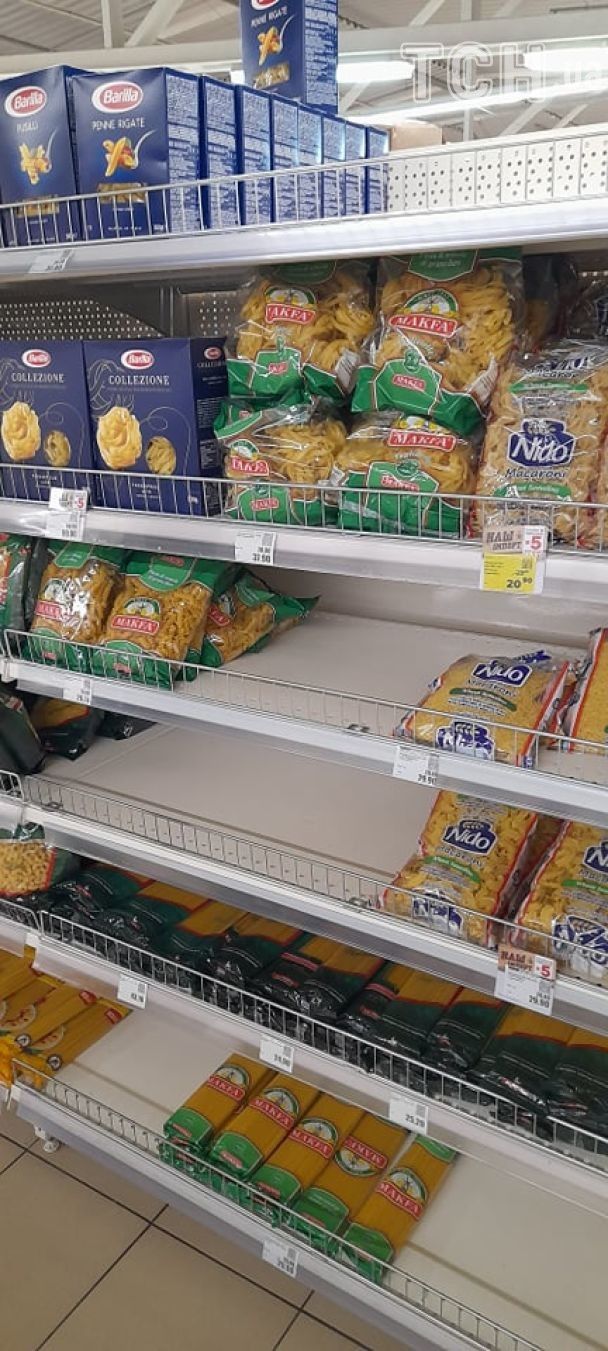Однако в супермаркетах на полках хватает всего. Ажиотажа нет. Гречки хватает, муки, соли. Горожане охотно покупают экзотические фрукты.