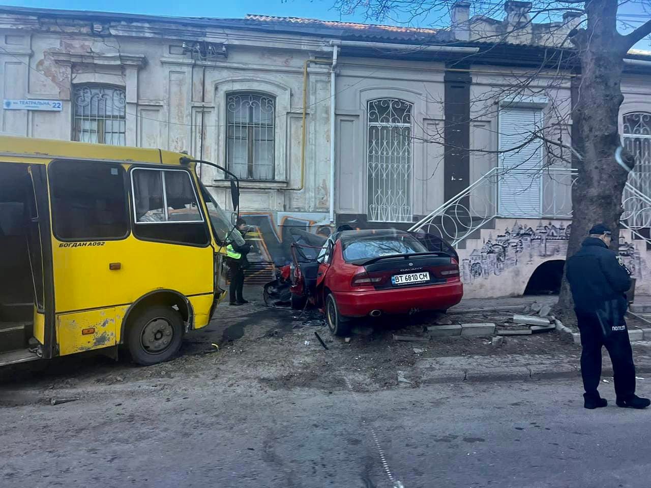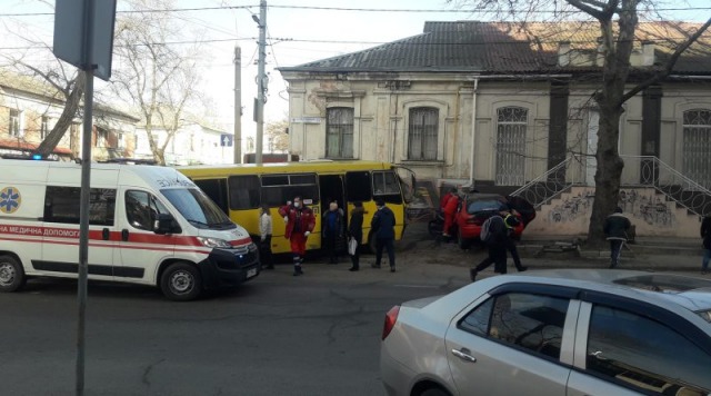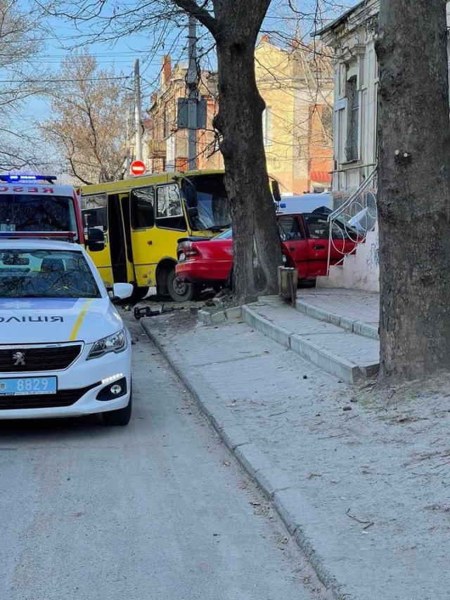 На углу улиц Театральная и Ришельевская не поместились на дороге легковой автомобиль и маршрутка. Авто влетело в стену здания, автобус также занесло на тротуар.