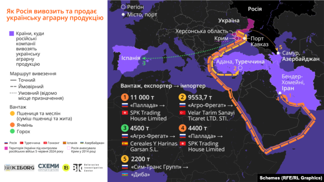 34 тисячі тонн пшениці, ячменю, кукурудзи та гороху, експорт якого вдалося підтвердити журналістам завдяки витоку документів та перевірці по базах імпорту-експорту, – це лише мала частина вивезеної за квотами 2023 року з окупованої частини України агропродукції.За даними Nasa Harvest, минулого року на цих територіях зібрали не менше 6,4 мільйона тонн тільки пшениці. Два мільйони тонн, за інформацією центру SeaKrime, вивезли через порти окупованого Криму. Експертка SeaKrime Катерина Яресько припускає, що інші чотири мільйони вивозяться на територію Росії і далі відвантажуються вже як російське зерно.