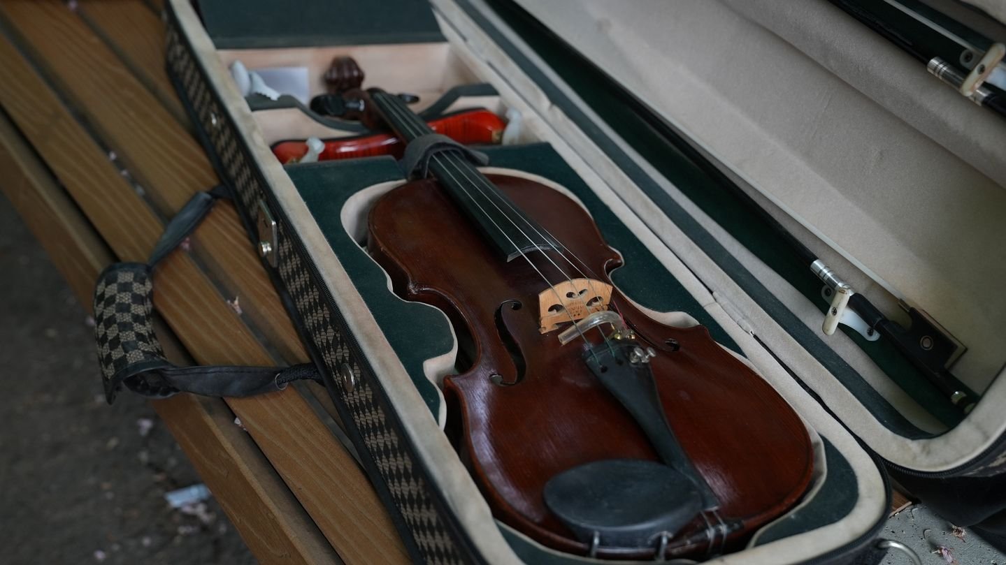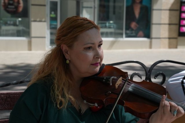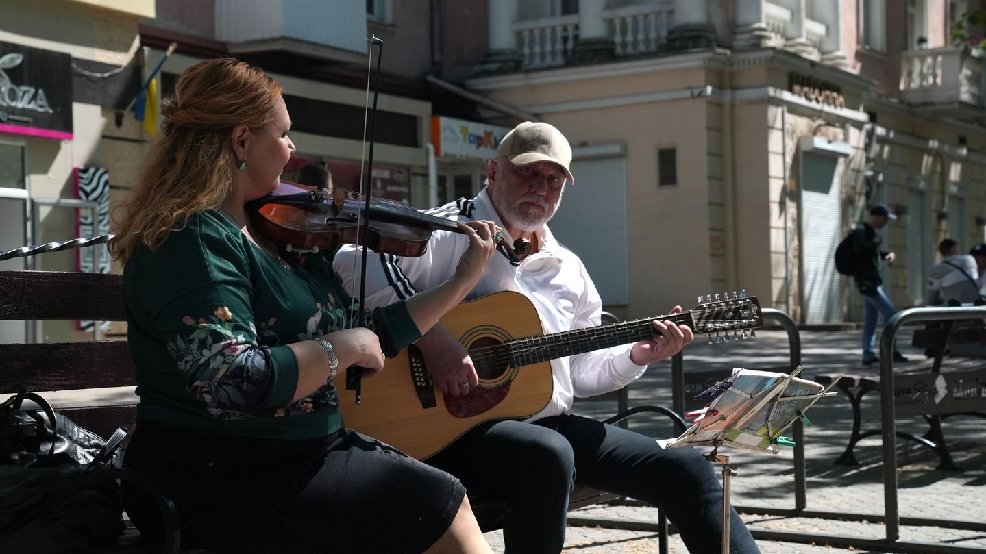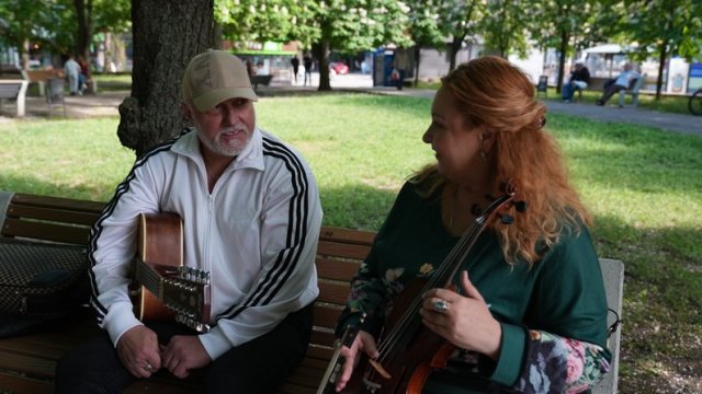 Переселенці з Херсона Ігор та Аліна двічі на тиждень грають на музичних інструментах у центрі Миколаєва. Він — на гітарі, вона — на скрипці. У репертуарі мають 120 композицій у стилі рок-н-ролу.